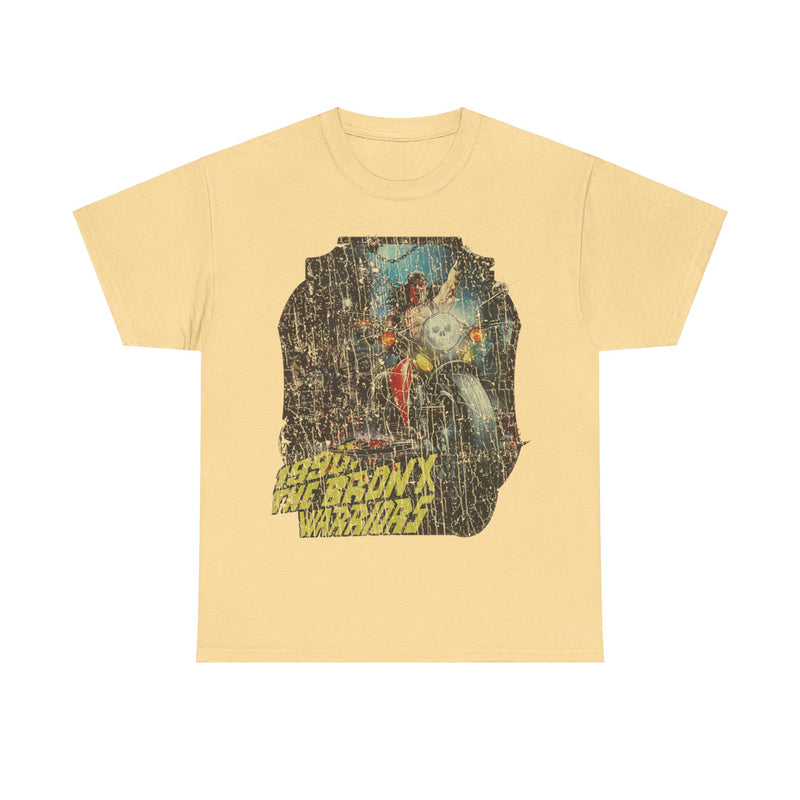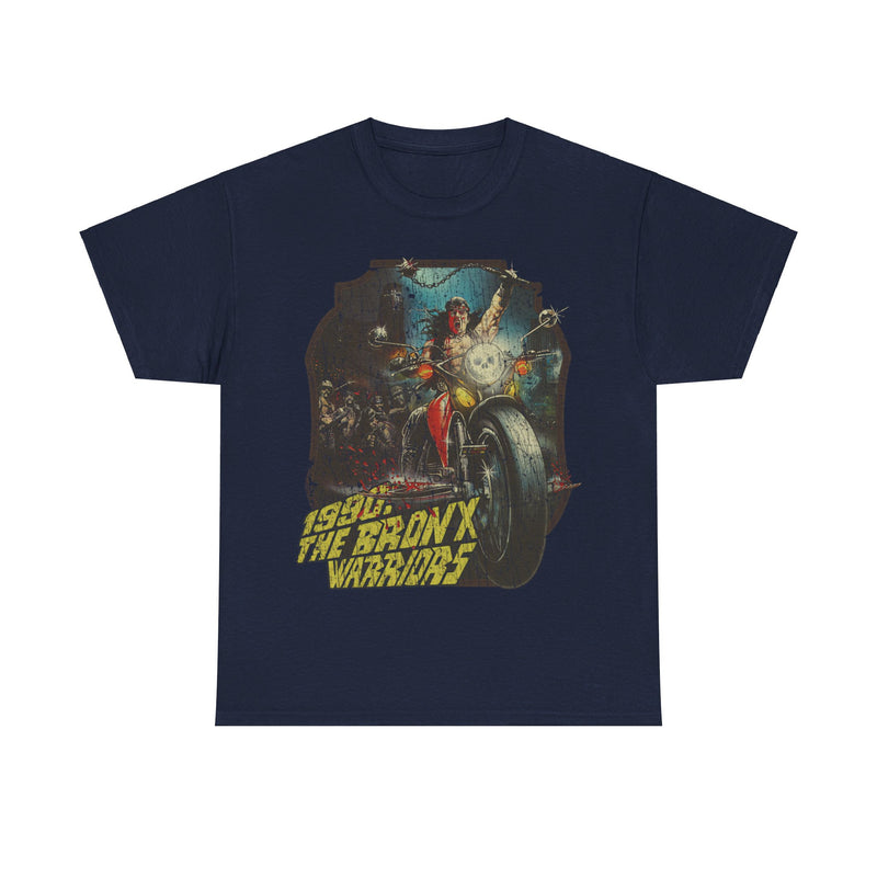 Choose from a variety of popular colors to match your style. The front of the shirt proudly displays the "1990: The Bronx Warriors" logo, complete with a distressed, cracked effect that gives it a vintage, well-worn look. This weathered appearance adds character and authenticity, as if the shirt has survived its own urban apocalypse. The back of the shirt is left blank, allowing the cult movie design to take center stage.