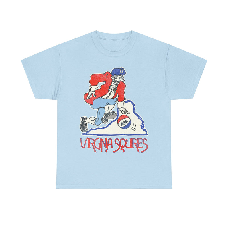 This vintage Virginia Squires t-shirt is a must-have piece of nostalgic sports apparel celebrating one of the most distinctively-branded and anti-establishment franchises from pro basketball's renegade ABA era. It proudly displays the iconic Squires logos and aesthetics that delightfully juxtaposed old-world nobility with the rebel league's irreverent, counter-culture mentality.