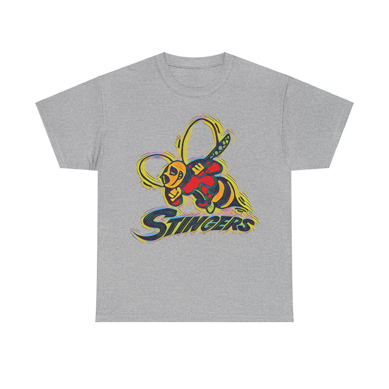 This 100% cotton tee features the vintage 90s Syracuse Stingers logo printed in their iconic yellow and black team colors. Available in sizes S-5XL with your choice of various color options. Front graphic only with a blank back.