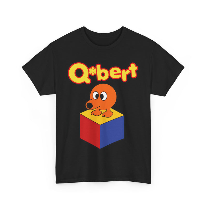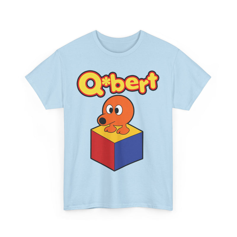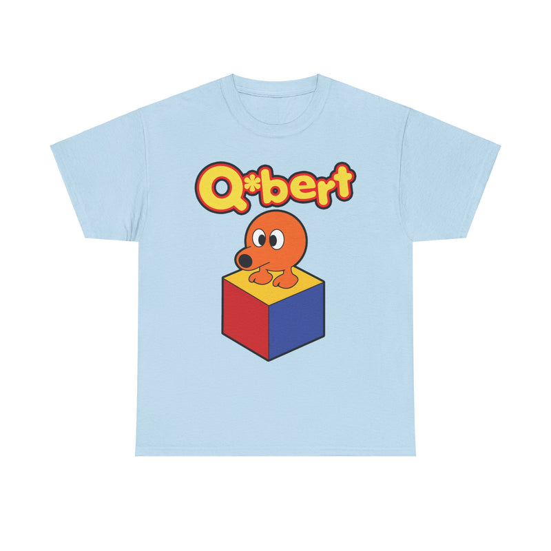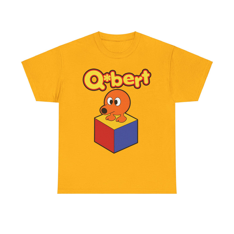 Jump back to 1982 with this Q*bert inspired tee featuring the iconic logo from the golden age of arcade gaming. The deliberately distressed vintage finish captures the well-worn feel of countless hours spent hopping through isometric pyramids in smoky arcades across America.