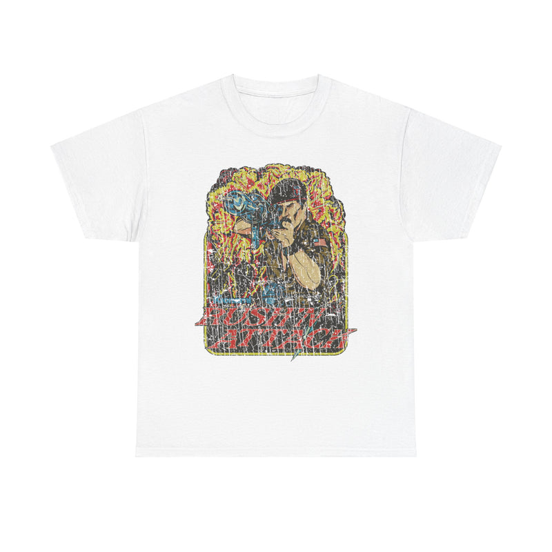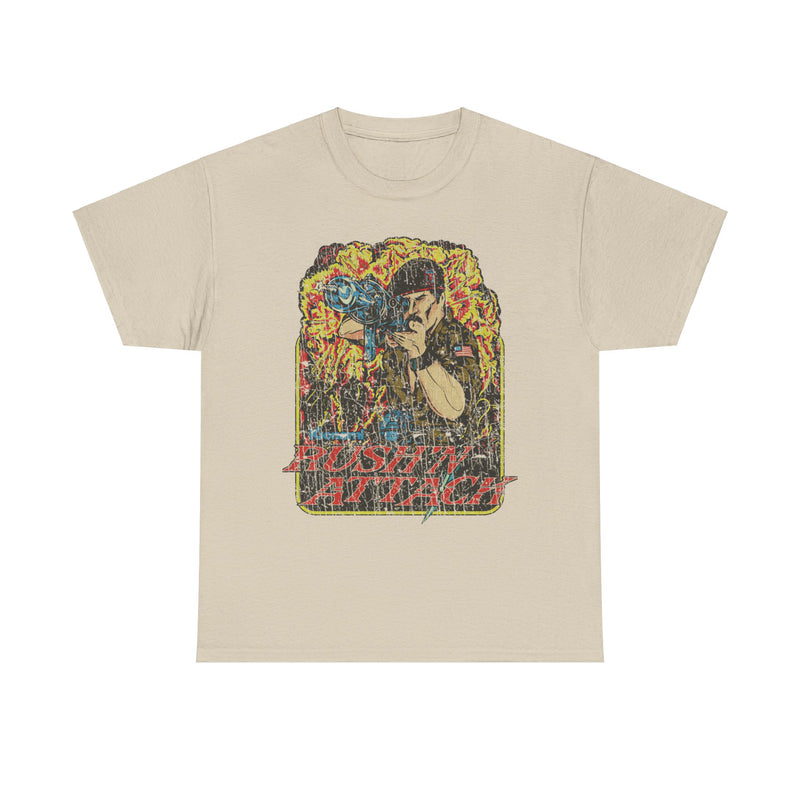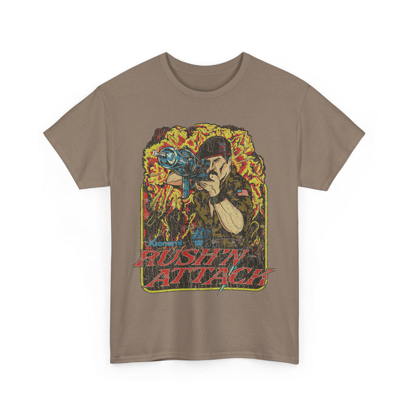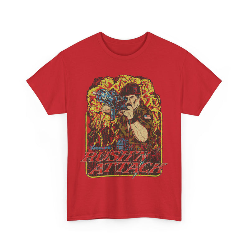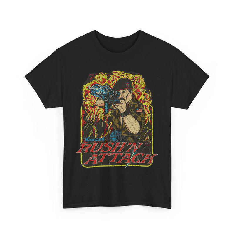 Relive the Cold War arcade classic with our Rush'n Attack (1985) gaming t-shirt. Originally released by Konami as "Green Beret" in Japan, this side-scrolling action game captured players with its intense knife combat and limited-ammo weapon pickups. Despite strong initial success in arcades, the game's popularity waned as more sophisticated titles emerged in the late 80s.