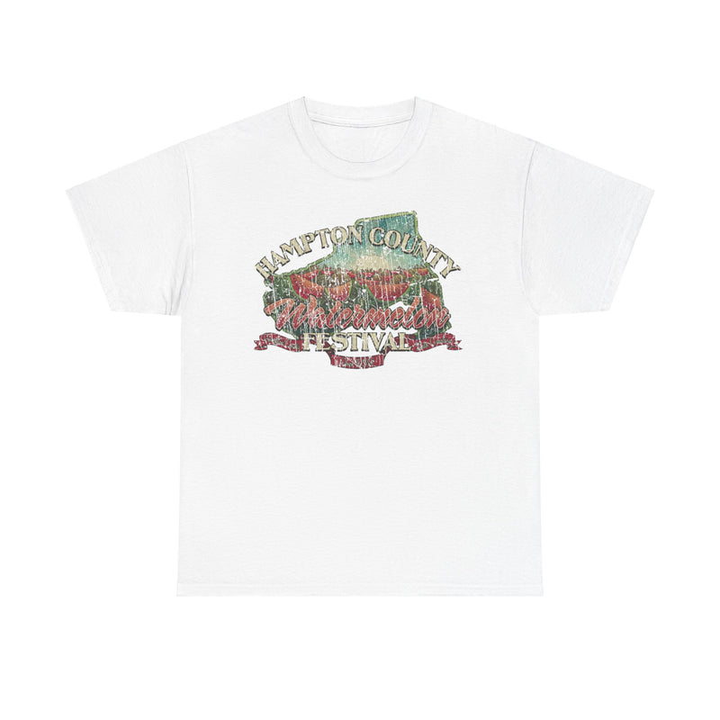 Our shirt features a vintage-inspired design on the front, showcasing the festival's logo or a stylized watermelon slice with "Hampton County Watermelon Festival" prominently displayed. The distressed, sun-faded look gives it an authentic, well-loved appearance as if it's been worn to many summers of festive fun. The back of the shirt is left blank, allowing the front design to be the juicy centerpiece.
