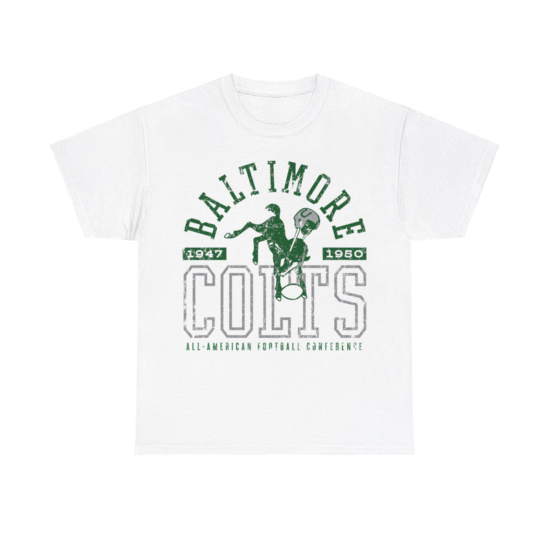 Available in sizes S through 5XL and a variety of popular colors, this shirt is perfect for football history enthusiasts, Baltimore sports fans, or anyone who appreciates vintage athletic aesthetics. Whether you're attending a Ravens game, exploring Baltimore's sports bars, or simply relaxing at home, this Colts tee is sure to spark conversations about a fascinating but often overlooked period in football history.