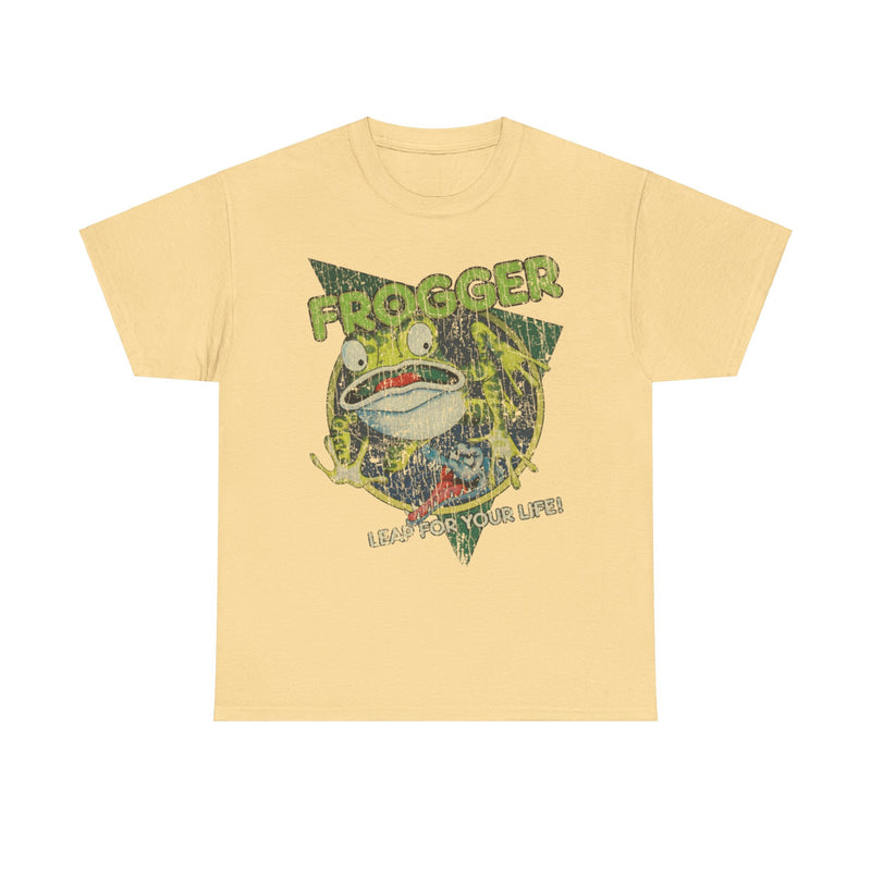 This 100% preshrunk cotton tee features the classic Frogger "Leap For Your Life" distressed graphic printed on a standard unisex fit from Gildan. The cracked and faded print exudes amazing retro gaming vibes. Available in a range of colors that'll transport you straight to the neon-soaked arcade. It's a standard unisex fit crafted from 5.3 oz 100% cotton, with the nostalgic distressed design featured on the front and a blank back. Printed on a quality Gildan 5000 shirt with a tear-away label. Machine wash cold, tumble dry low.