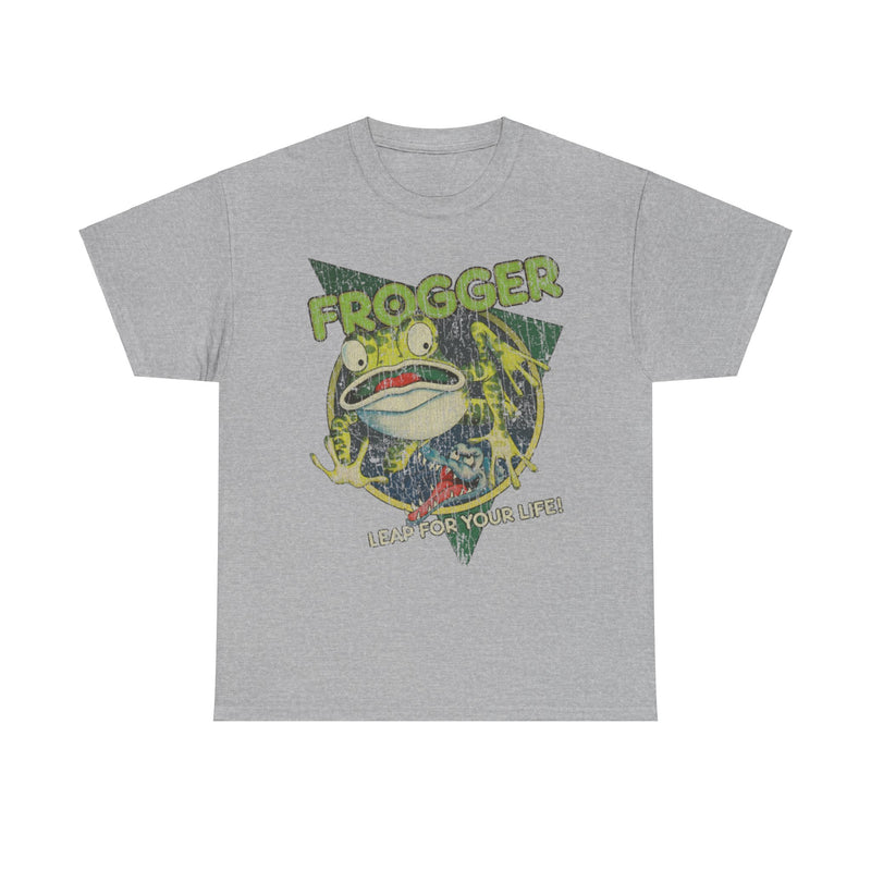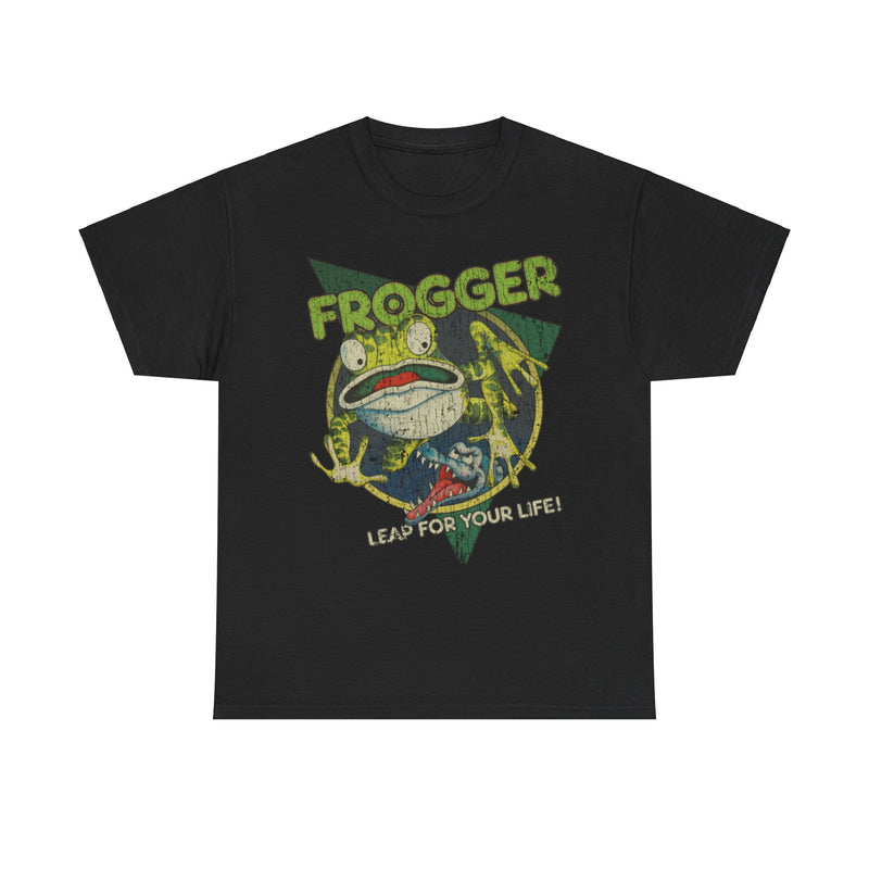 Join the retro gaming craze with this distressed print tee celebrating the classic arcade hit Frogger! Back in 1981, this simple but insanely addictive game had players guiding a daring frog across a treacherous road and river, desperately trying to avoid the relentless traffic and hungry gators. The iconic "Leap For Your Life" slogan and frog design became an instantly recognizable emblem of 80s gaming culture.