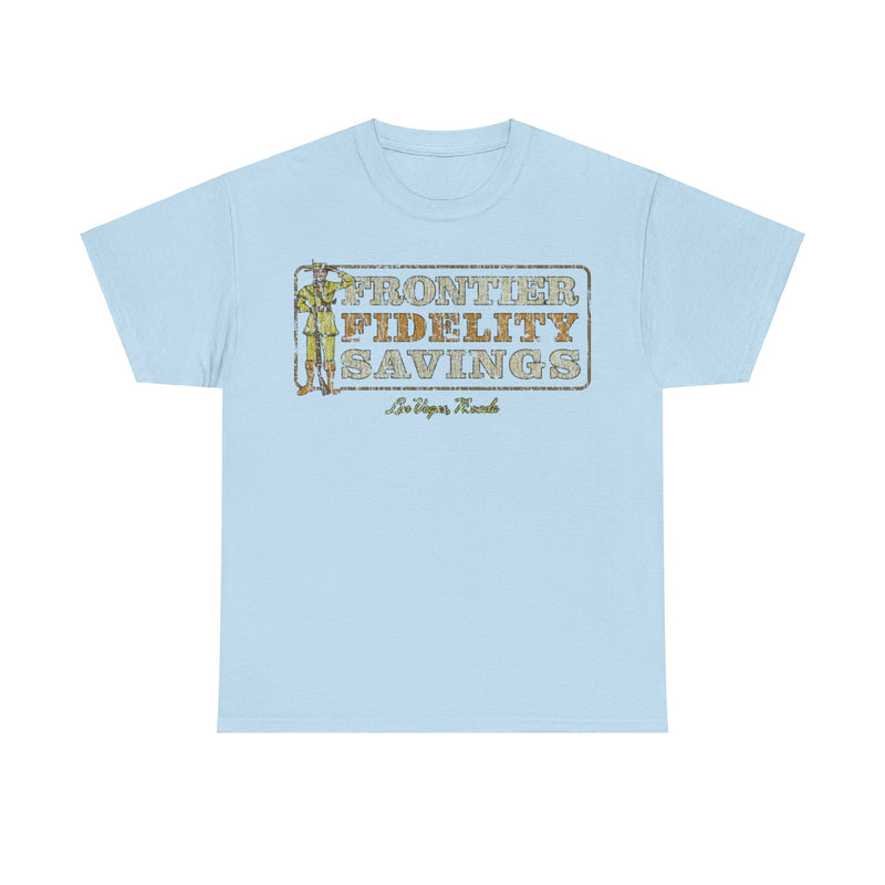 This 100% preshrunk cotton tee features the classic Frontier Fidelity Savings distressed logo graphic printed on a standard unisex fit from Gildan. The cracked and faded print has an authentically vintage, straight-from-the-vault aesthetic. Available in a range of colors reminiscent of the era's conservative yet stylish fashion. Constructed from a sturdy 5.3 oz 100% cotton base, with the nostalgic distressed design on the front and a clean blank back. Printed on a quality Gildan 5000 shirt with a tear-away label. Machine wash cold, tumble dry low.