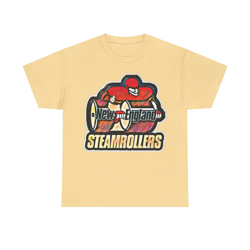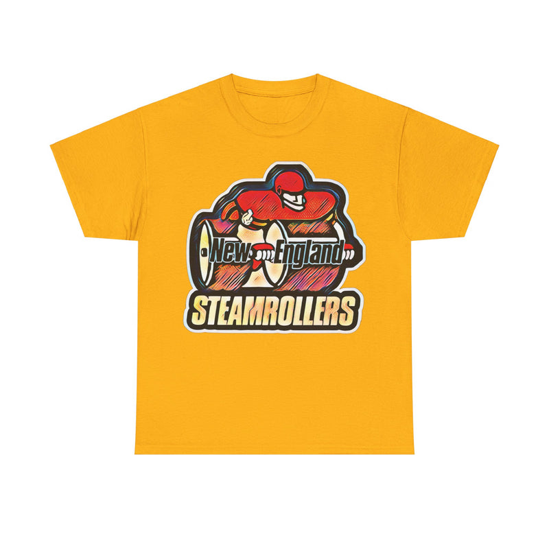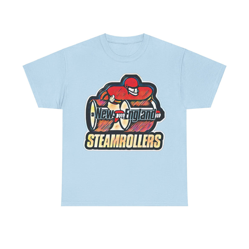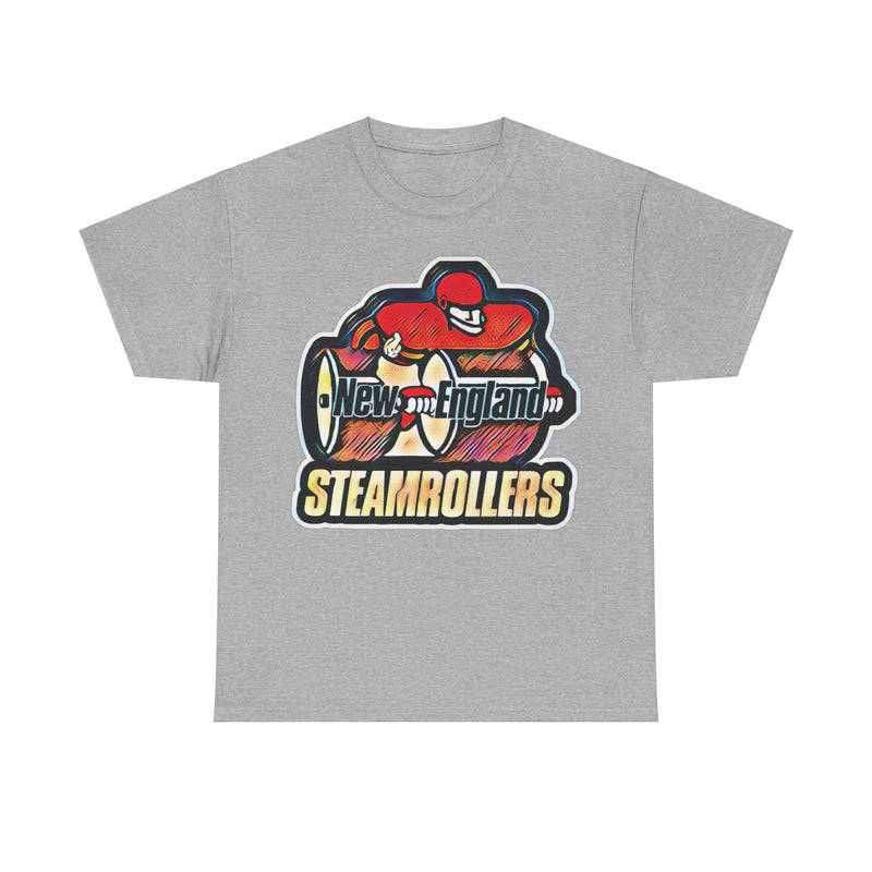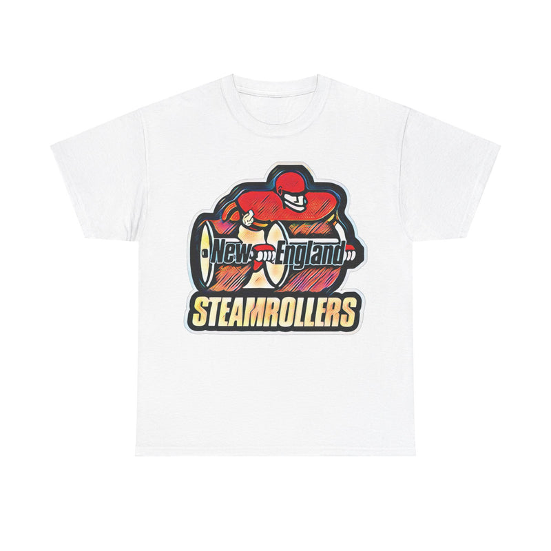 Celebrate a unique chapter in New England football history with our New England Steamrollers T-shirt. This classic tee features the team's distinctive logo on the front, rendered with a distressed, cracked finish that gives it an authentic vintage look and feel, perfectly capturing the spirit of this short-lived but memorable franchise.